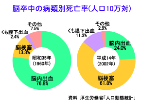 Vol.07 脳卒中のはなし脳卒中の種類と症状脳卒中は長い間日本人の死因の第1位を占めていましたが、現在では悪性新生物・心疾患についで第3位に下がっています。現在は、脳卒中の医療技術が進歩し、脳卒中になっても命が助かる例が増えています。また、脳卒中の発生も減少傾向にあることが疫学調査からも分っています。ただ、同じ脳卒中でも、病気によって多少傾向の違いがあります。