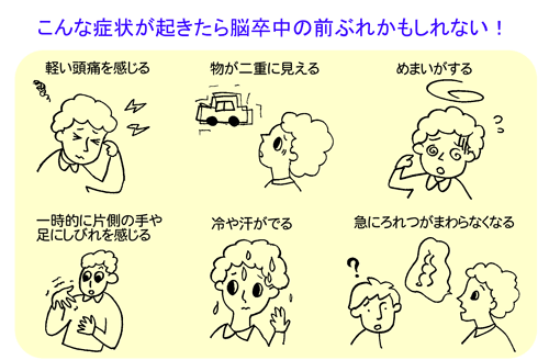 脳卒中は、脳の血管障害の総称で、脳内の血管が破れる「脳内出血」、脳を覆っている軟膜とその上のくも膜との間で出血する「くも膜下出血」、血管が詰まる「脳梗塞」に大別できます。 脳卒中・脳内出血・くも膜下出血・脳梗塞・・脳塞栓(心原性塞栓症)・脳血栓・ラクナ梗塞 かつて日本人に圧倒的に多いといわれたのは、脳内出血でした。しかし、最近は脳内出血の原因である高血圧の治療や予防が進み、確実に減ってきています。 今回は脳卒中の中でも死亡率が60%以上を占める“脳梗塞”を取り上げます。 春先から梅雨にかけて起こりやすい脳梗塞脳の動脈の内腔が途中で詰まってしまい、その先へ血液が流れなくなる病気です。その動脈から血液の供給を受けている脳の部分が、酸素不足に陥って死んでしまい(壊死)、はたらきが低下したり、失われたりします。 脳梗塞の発作は、突然あるいは少しずつ「手足の片側麻痺が起こる。ろれつが回らなくなる。まっすぐ歩けなくなる。ぼんやりする。」などの症状として現れます。脳は部位によってつかさどる機能が違うので、障害が起きた場所によって多様な症状が現れます。 時期的には春先から梅雨にかけて、季節の変わり目に起こりやすいようです。中には本格的な発作の前に一時的な発作(一過性脳虚血発作 ※)が起こることがあります。脳梗塞の重大な警告サインなので、見逃さないようにすることが大切です。 ※ 一過性脳虚血発作 ![]() 1.脳血栓 2.脳塞栓 3.ラクナ梗塞 脳卒中がおきたとき脳卒中は、発作がおきてから治療開始までの時間が、その後の後遺症などの予後に大きく関係するため、発作が起きたときの速やかな処置が肝心です。症状を見極めて落ち着いて処置し、すぐに医師に連絡することが大切です。 1.意識障害があるとき 2.医師・病院への連絡のポイント 脳卒中の前触れを見逃さず、早期治療を受けましょう! ![]()